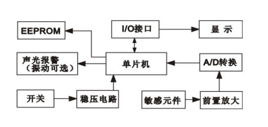 敏感元件产生的信号经线性放大后,经A/D 转换器转换,直接送往单片机进行数据处理,来完成仪器的显示、报警等功能。该测定器由中央处理单元、测量电路、A/D转换、数字显示、声光损誓等单元电路组成。